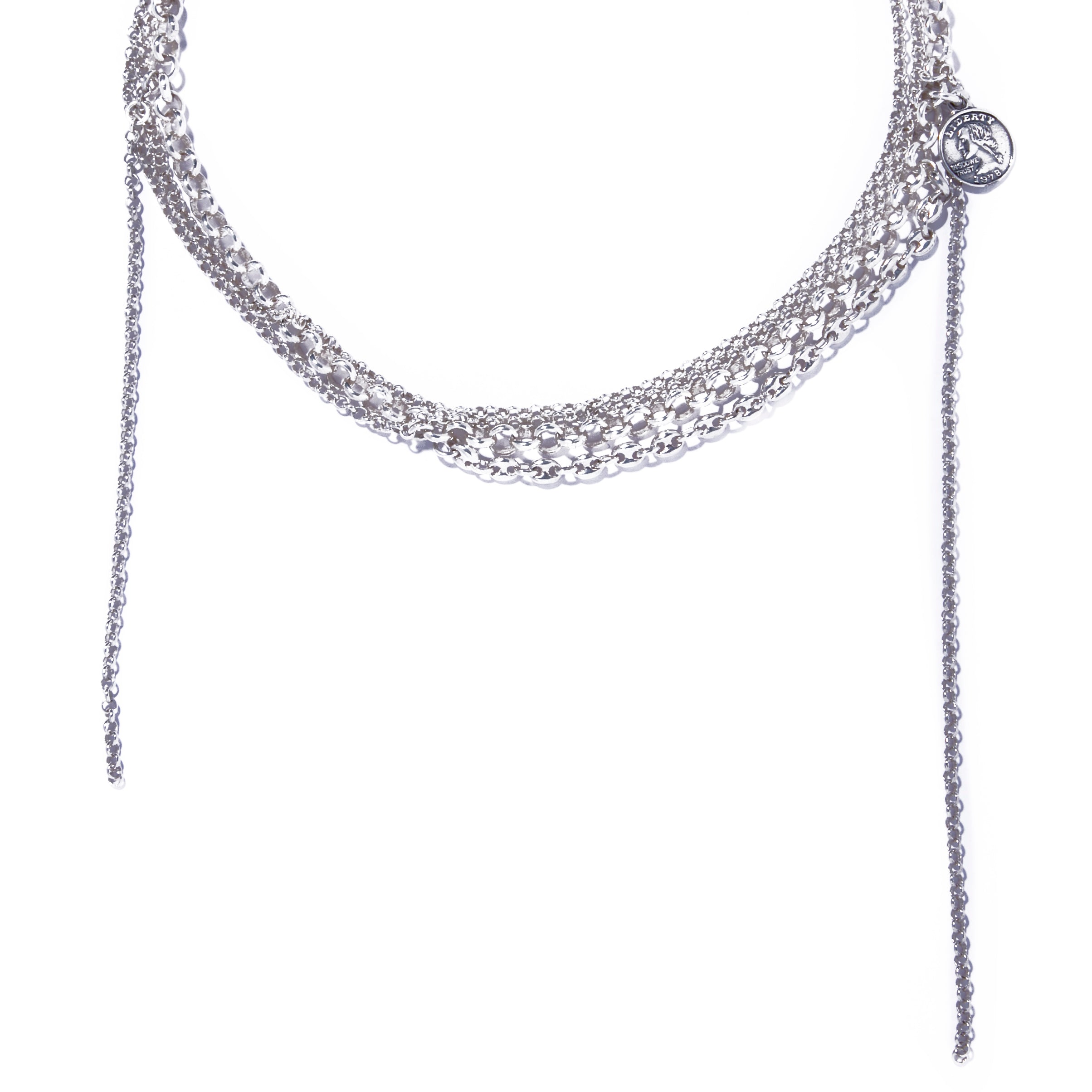カラーシャツの襟を開けた素肌に纏えば、シルバーのシャープさが際立ち、知的で落ち着いた雰囲気に。