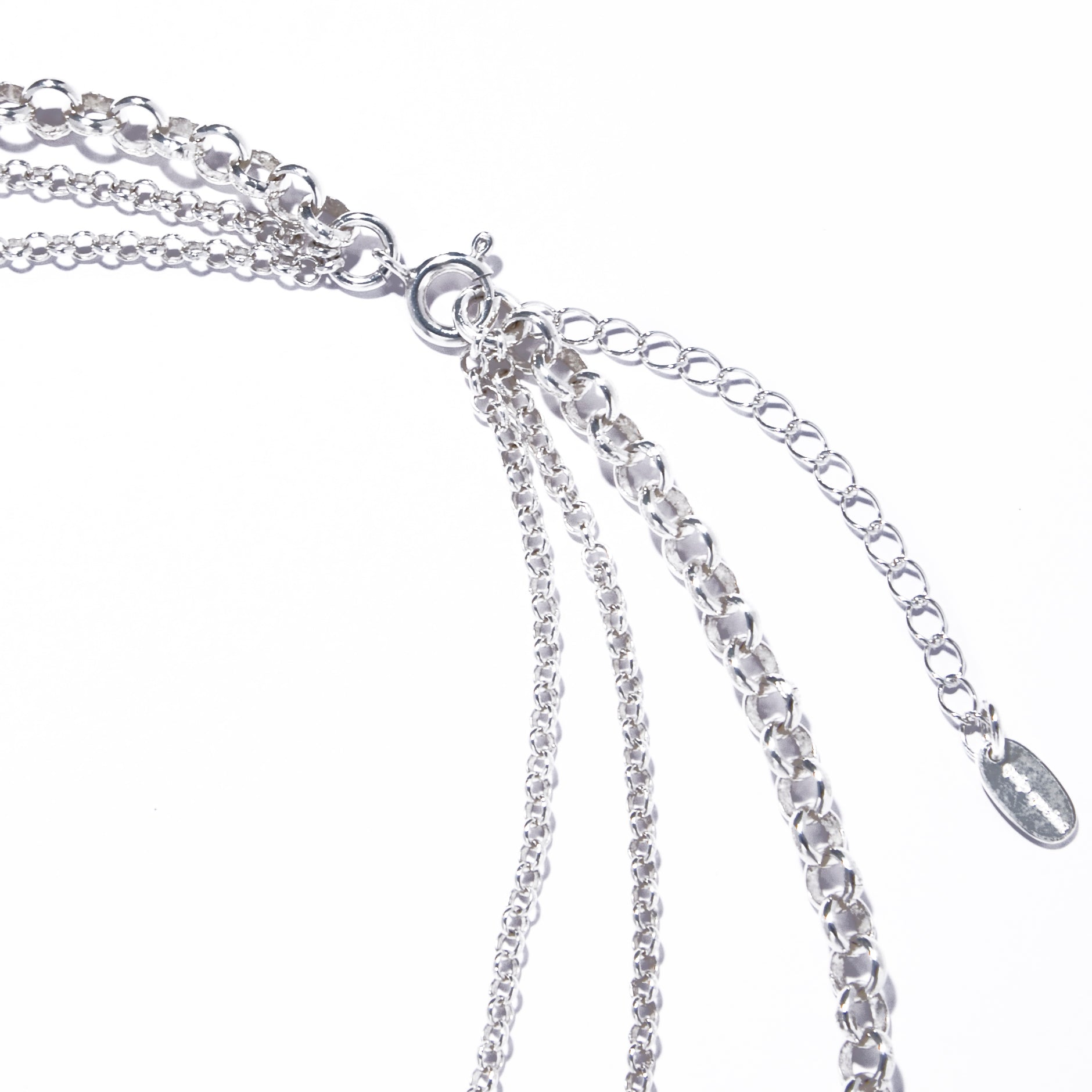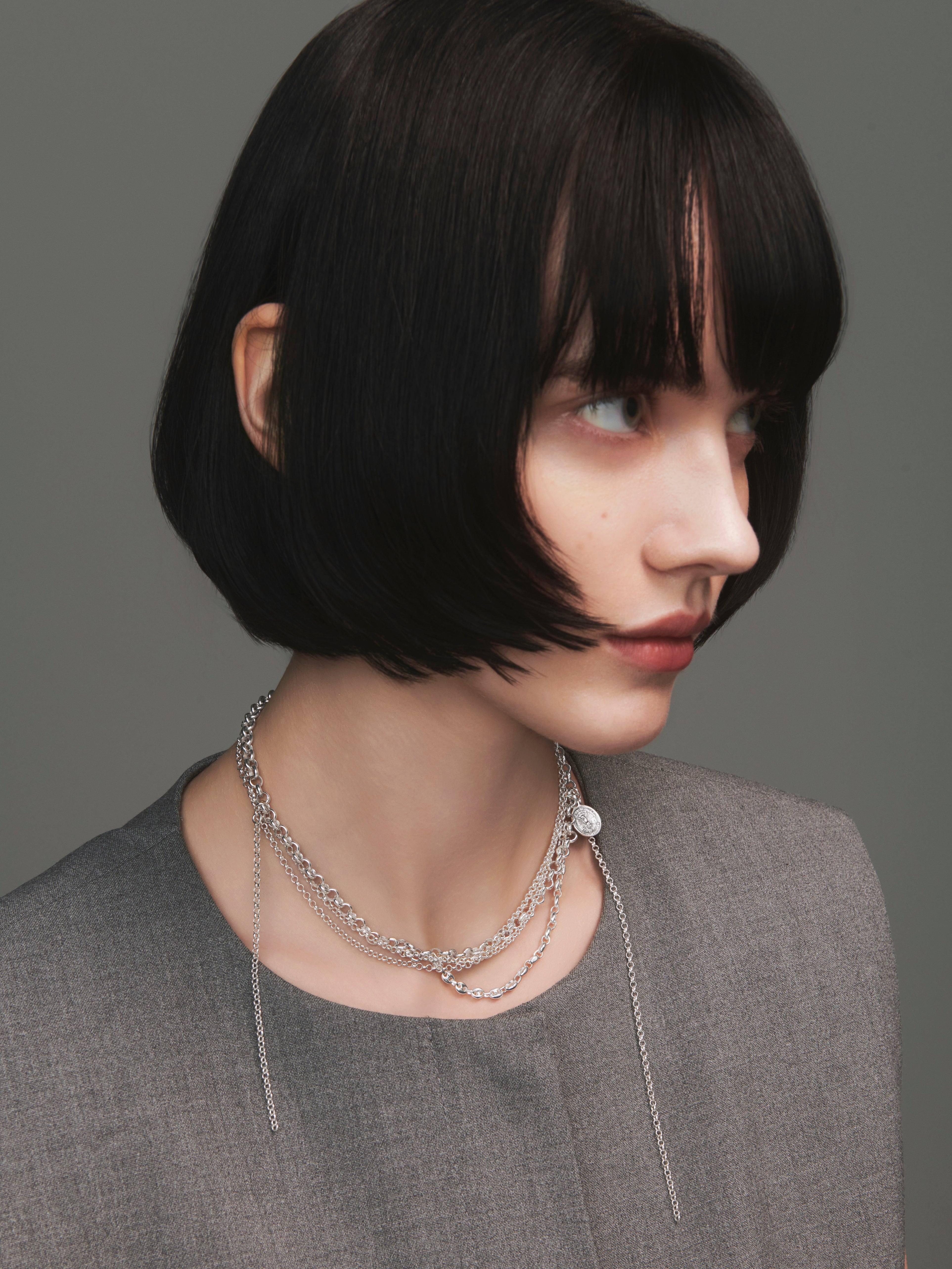 長さや表情の異なるチェーンを重ね合わせ、流れるようなリズムを描いたレイヤードネックレス。