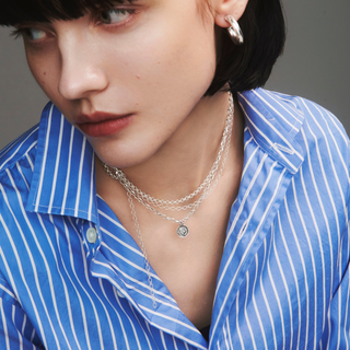 シルバー925の光沢を纏ったサイドにさりげなく配されたコインモチーフと揺れるロングチェーンがモダンな縦ラインを作り、洗練の中に遊び心を忍ばせています。