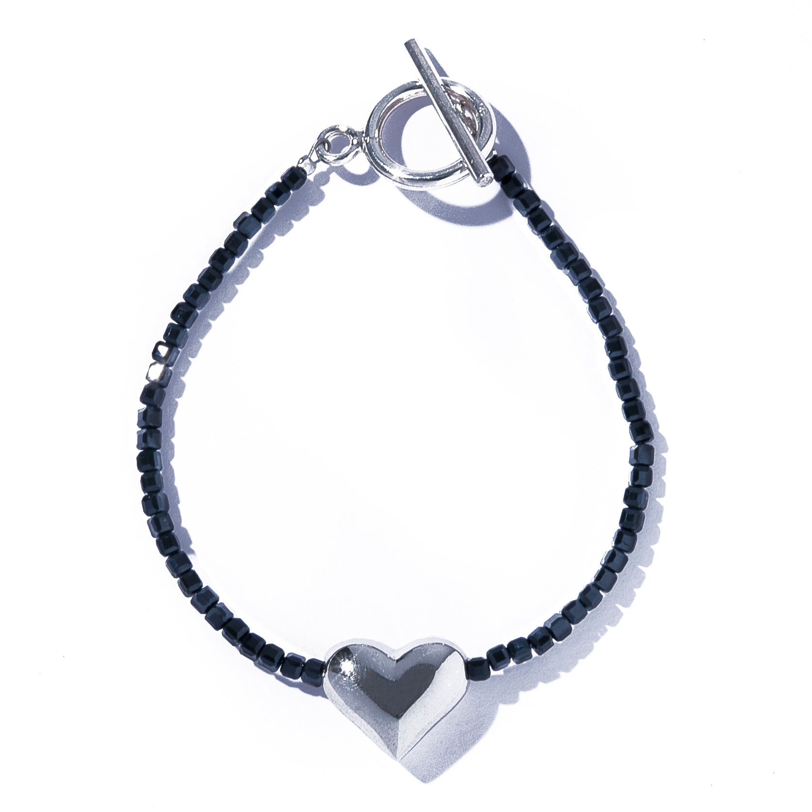 漆黒の夜空を閉じ込めたような、幻想的な輝きを放つブラックスピネルに大胆なハートモチーフが寄り添うブレスレット。