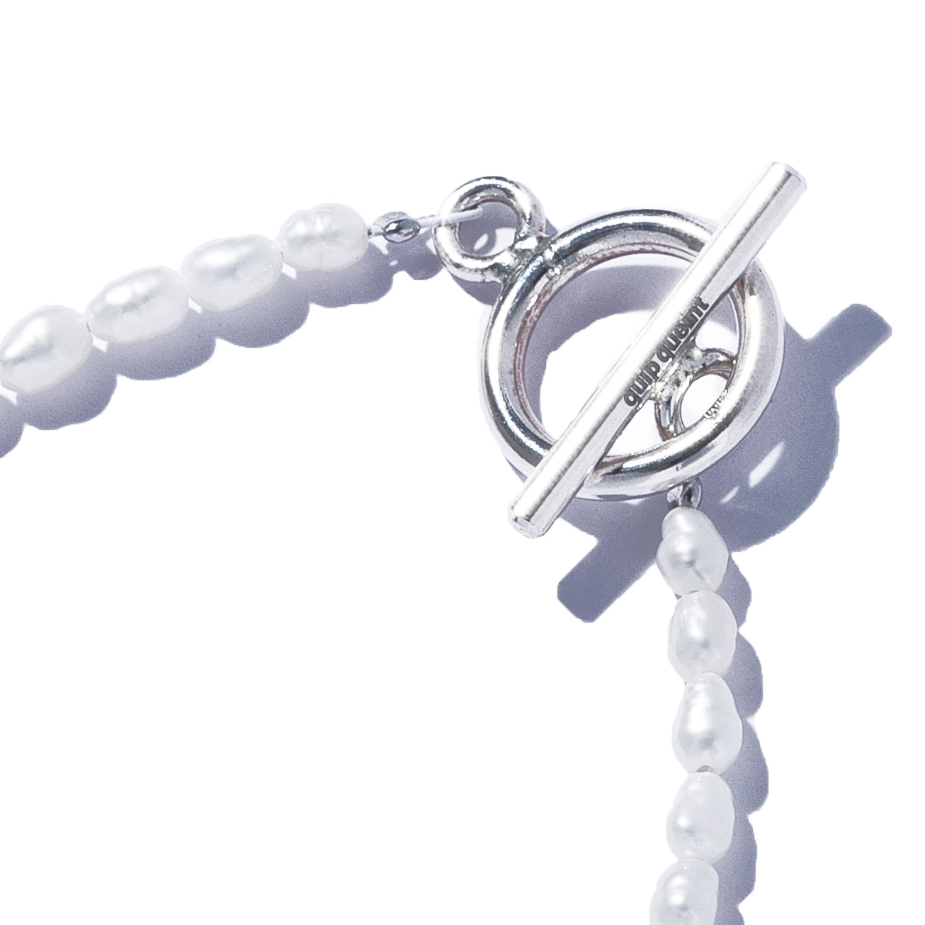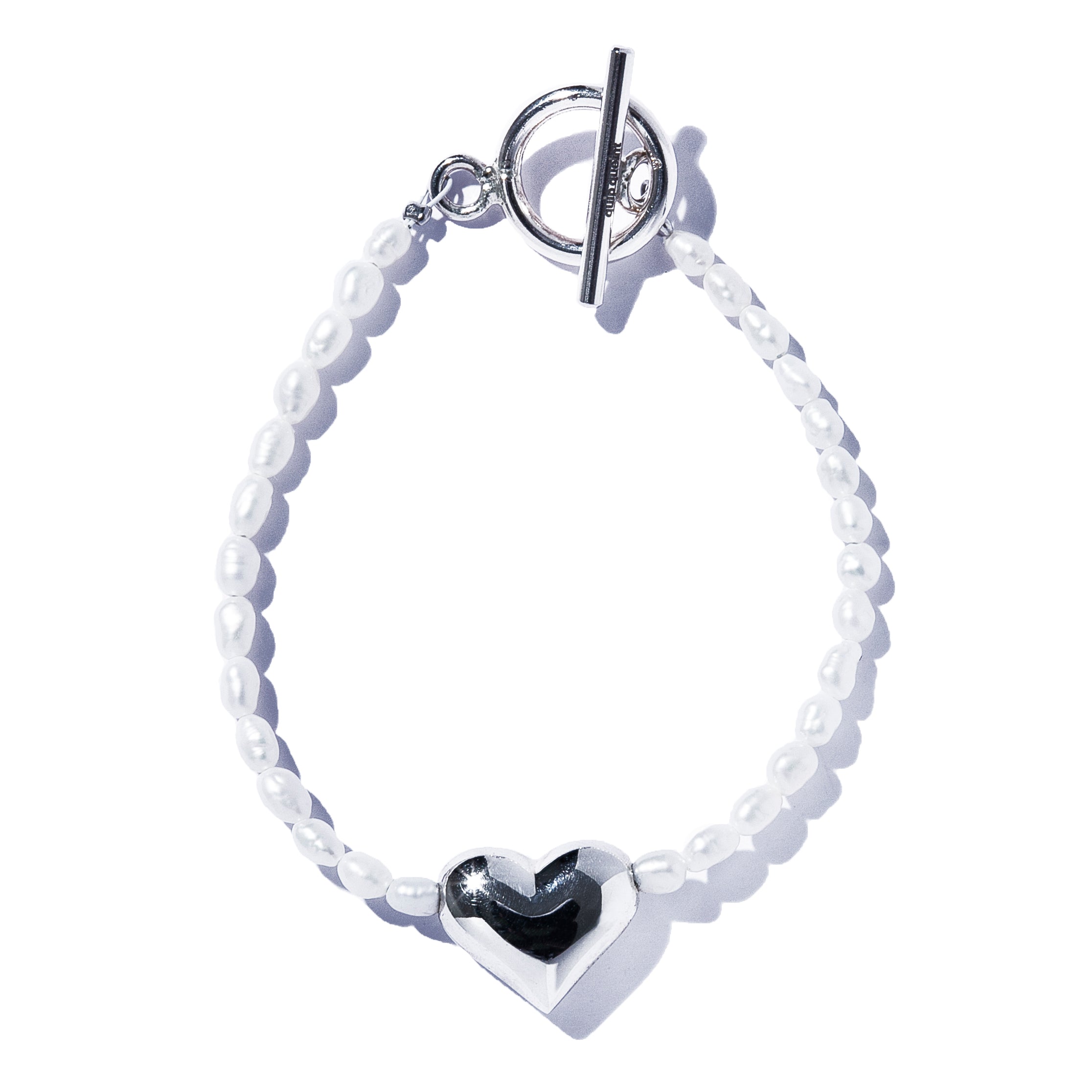 柔らかな光を宿した淡水パールと大胆なシルバーのハートモチーフを繋いだブレスレット。