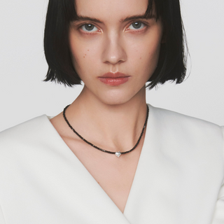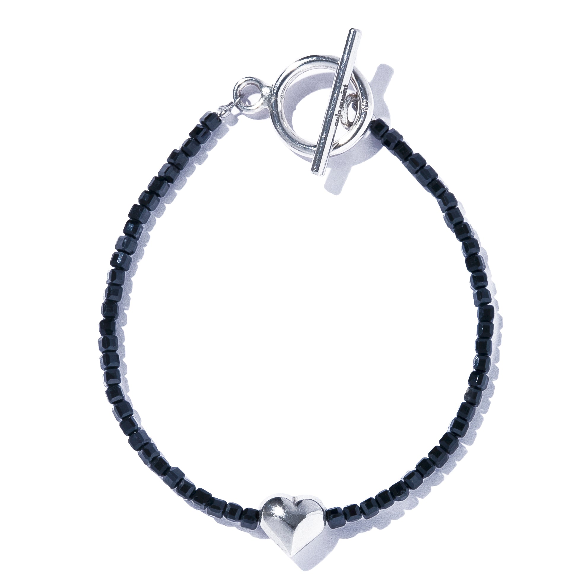漆黒の夜空を閉じ込めたような、幻想的な輝きを放つブラックスピネルに小ぶりなハートモチーフが寄り添うブレスレット。