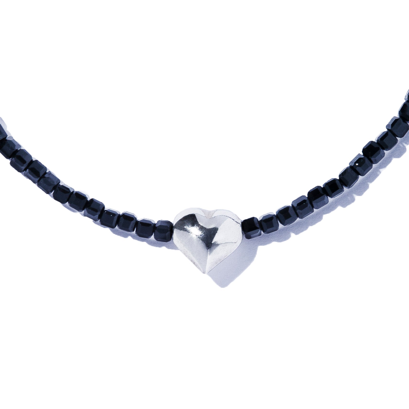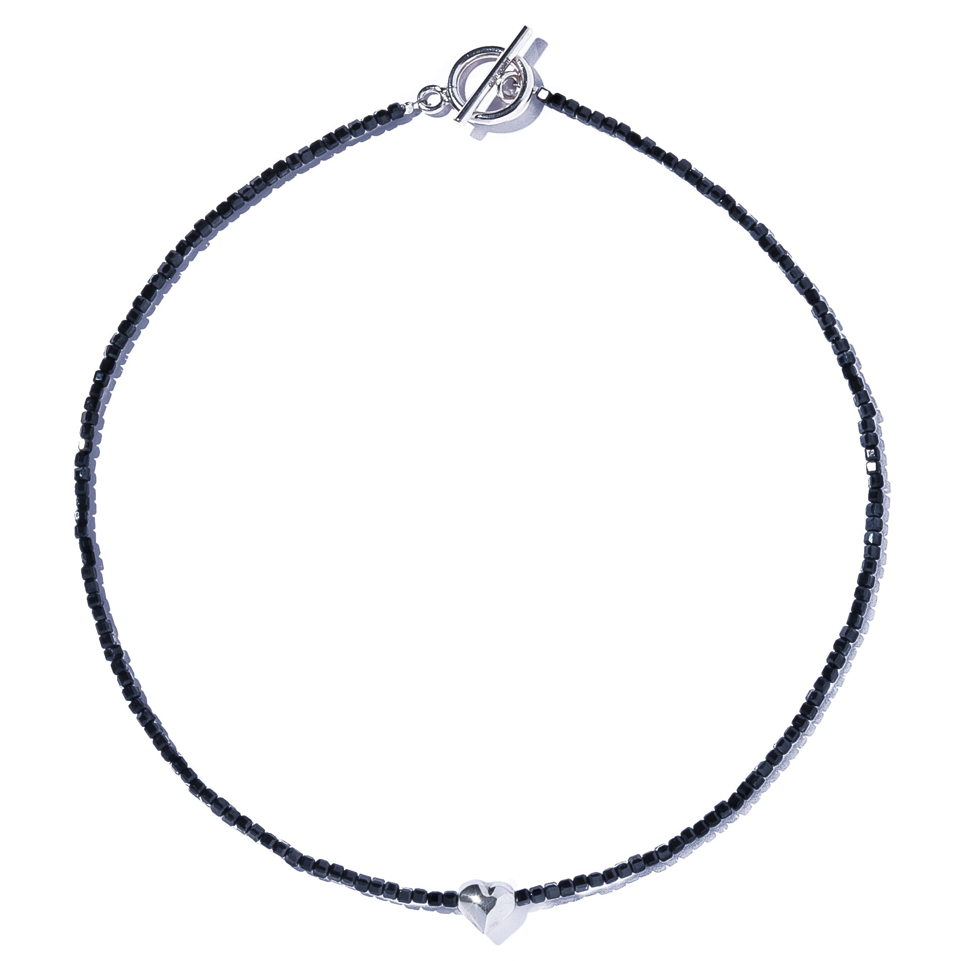 漆黒の夜空を閉じ込めたような、幻想的な輝きを放つブラックスピネルに小ぶりなハートモチーフが寄り添うネックレス。