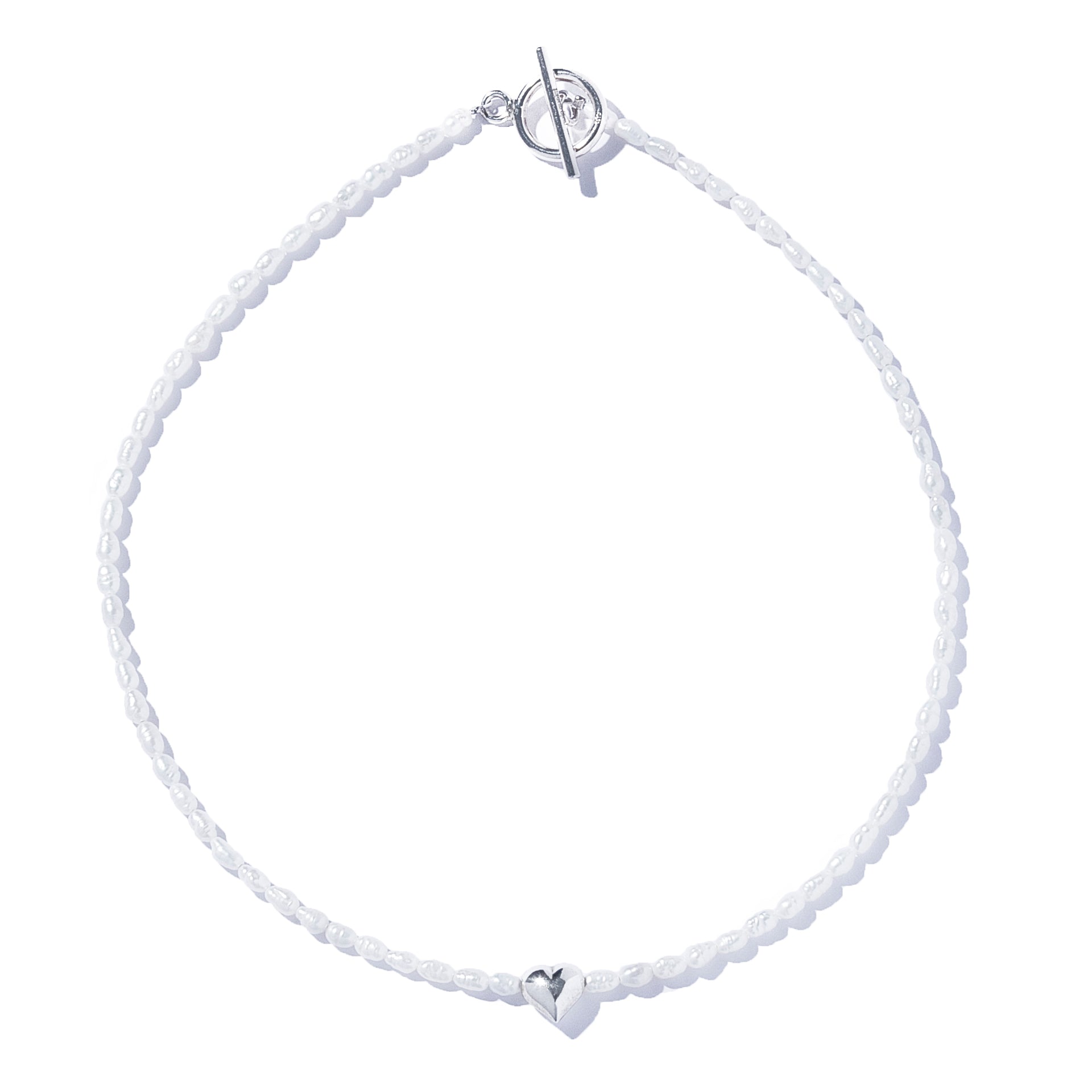 淡水パールの澄んだ艶が透明感を添え、シャープなシルバー925の光沢を纏ったハートがデコルテにモダンな存在感を放ちます。