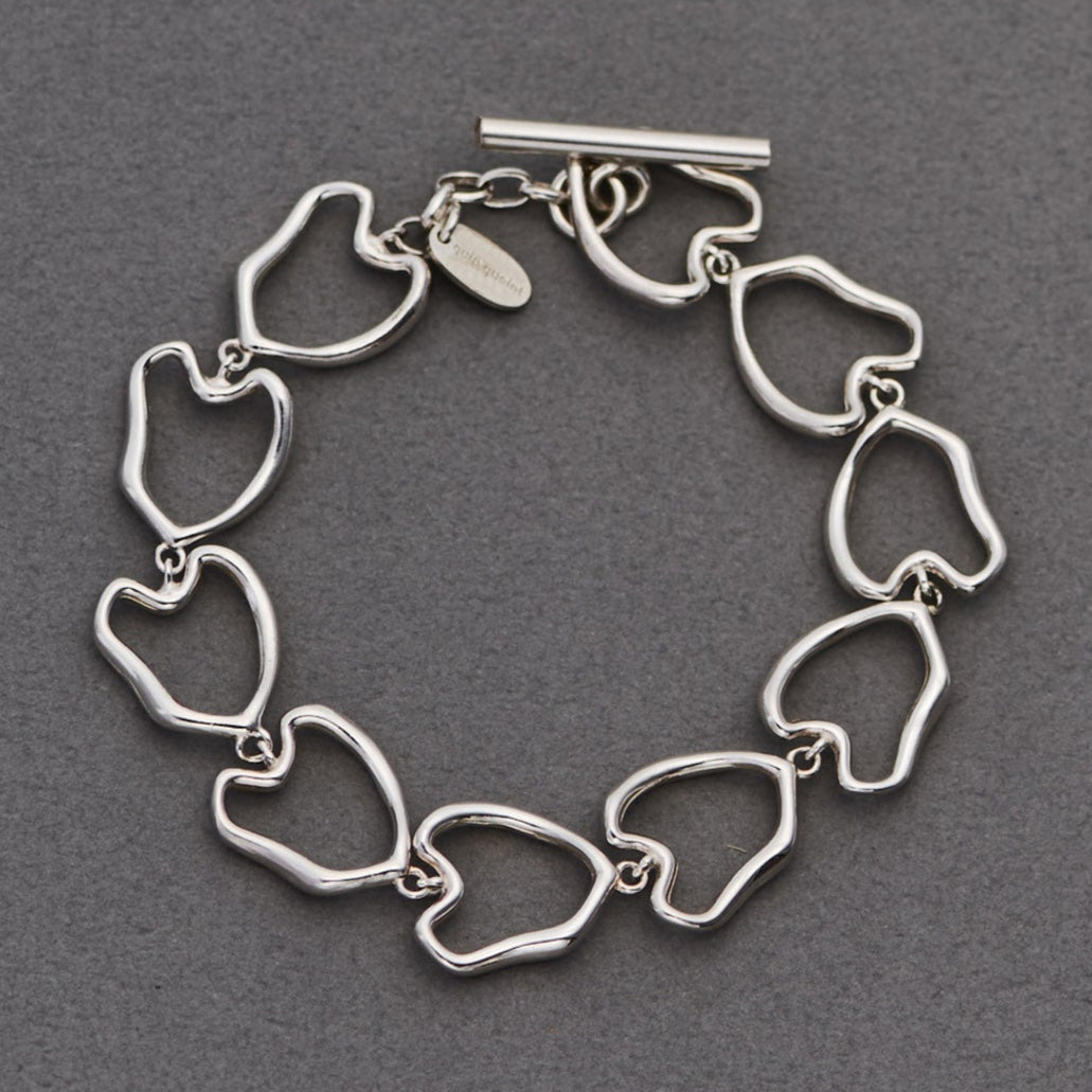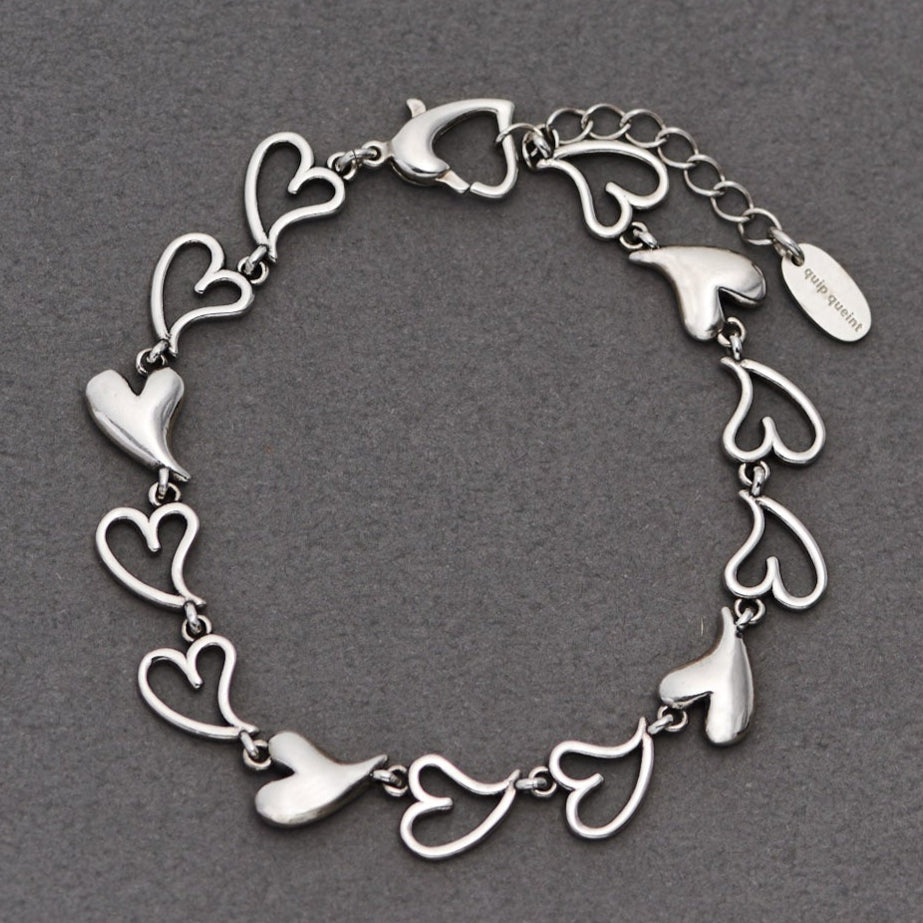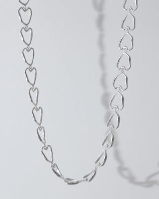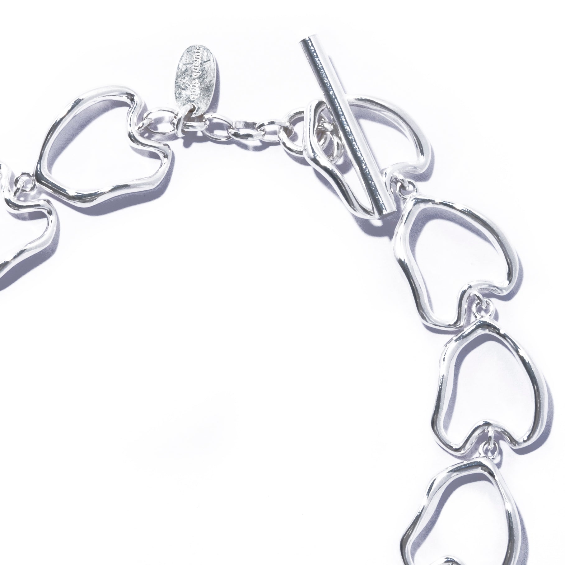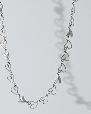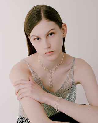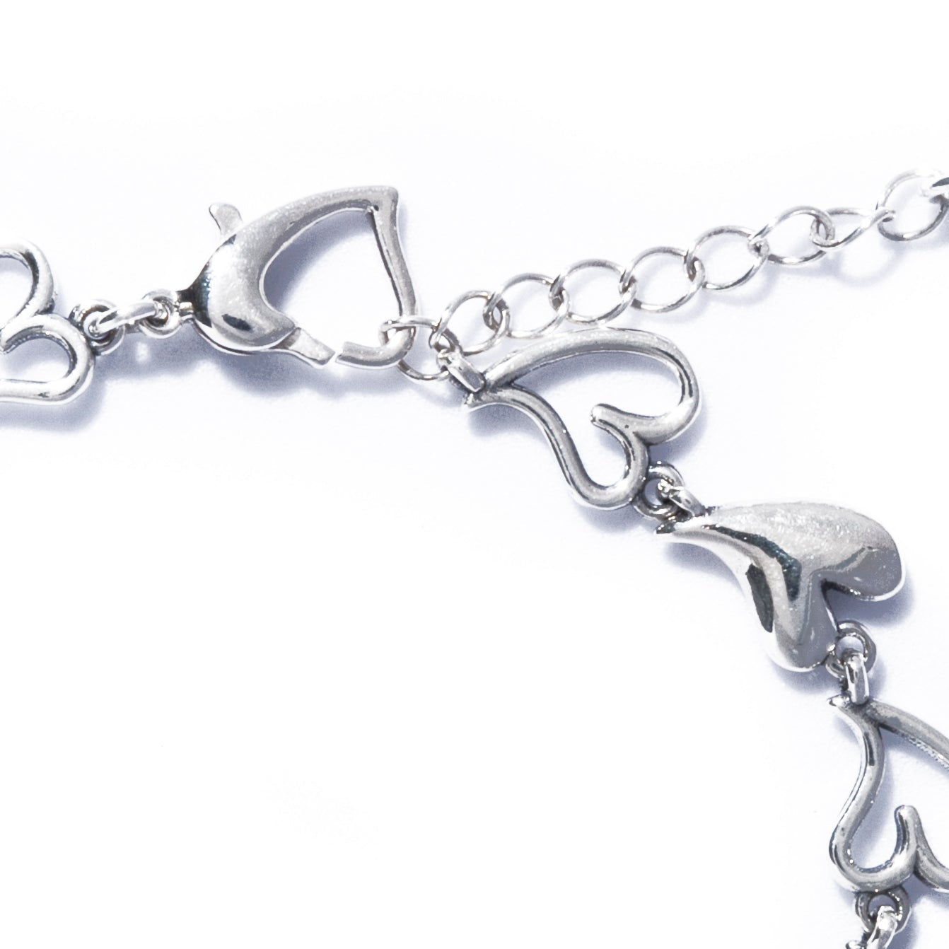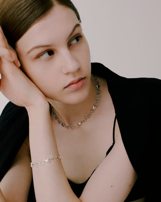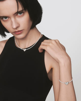 同デザインのブレスレットと合わせて着用するのも。短くしたい場合はオープンハートに留めてみて。