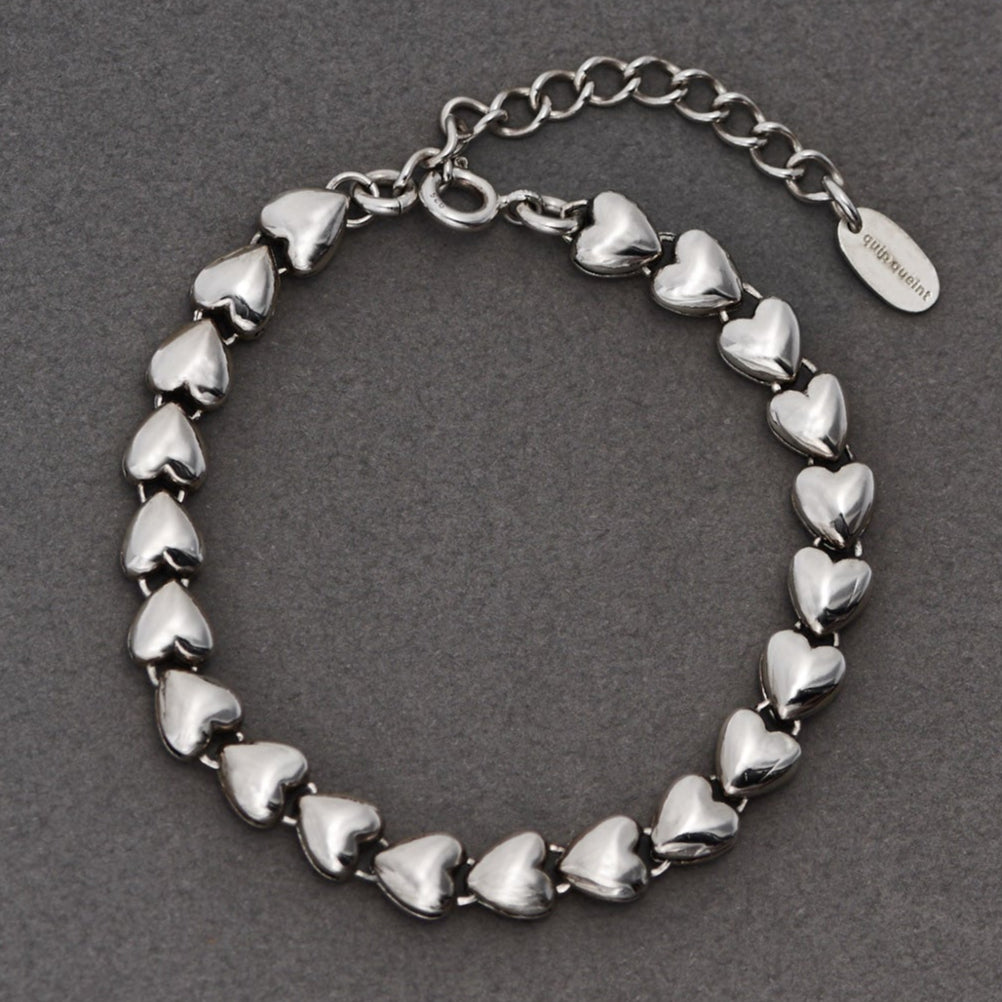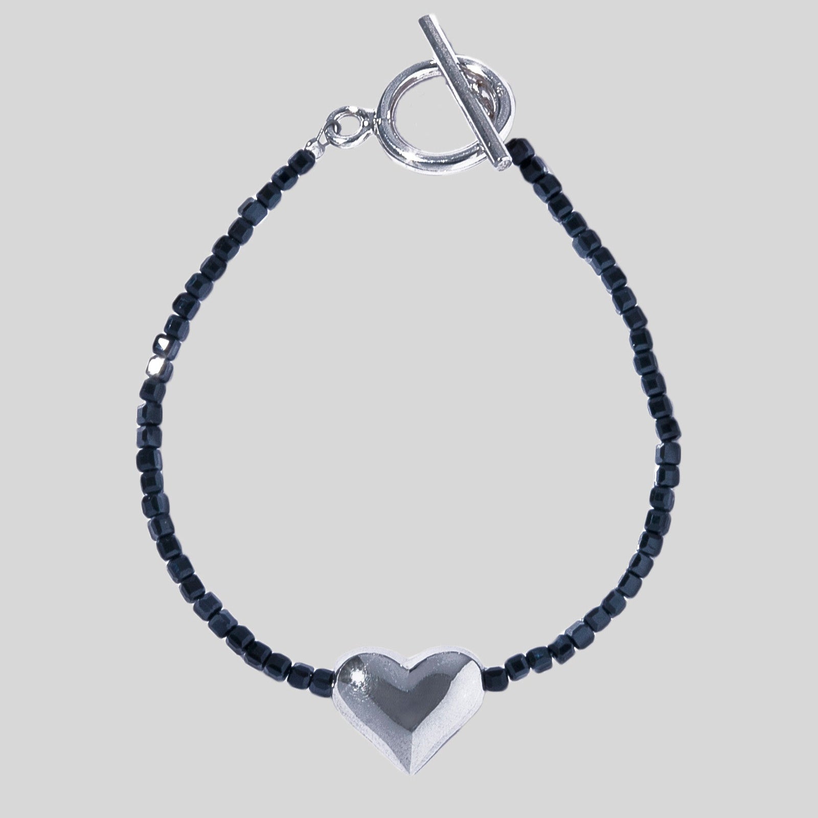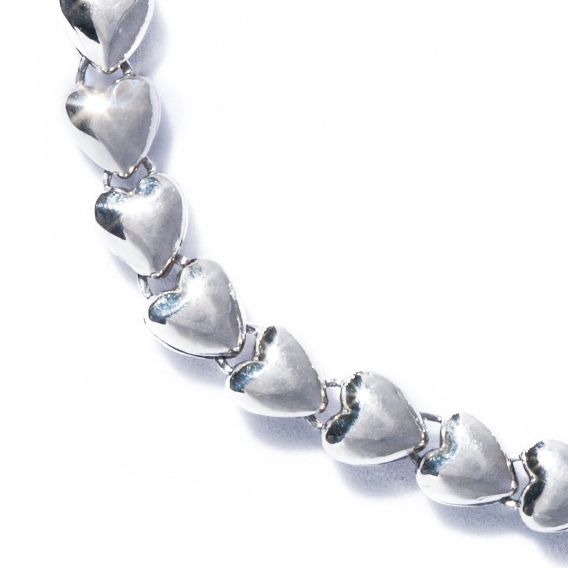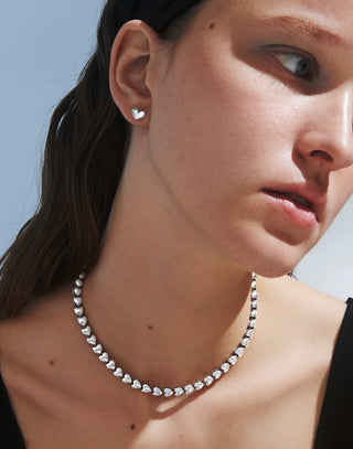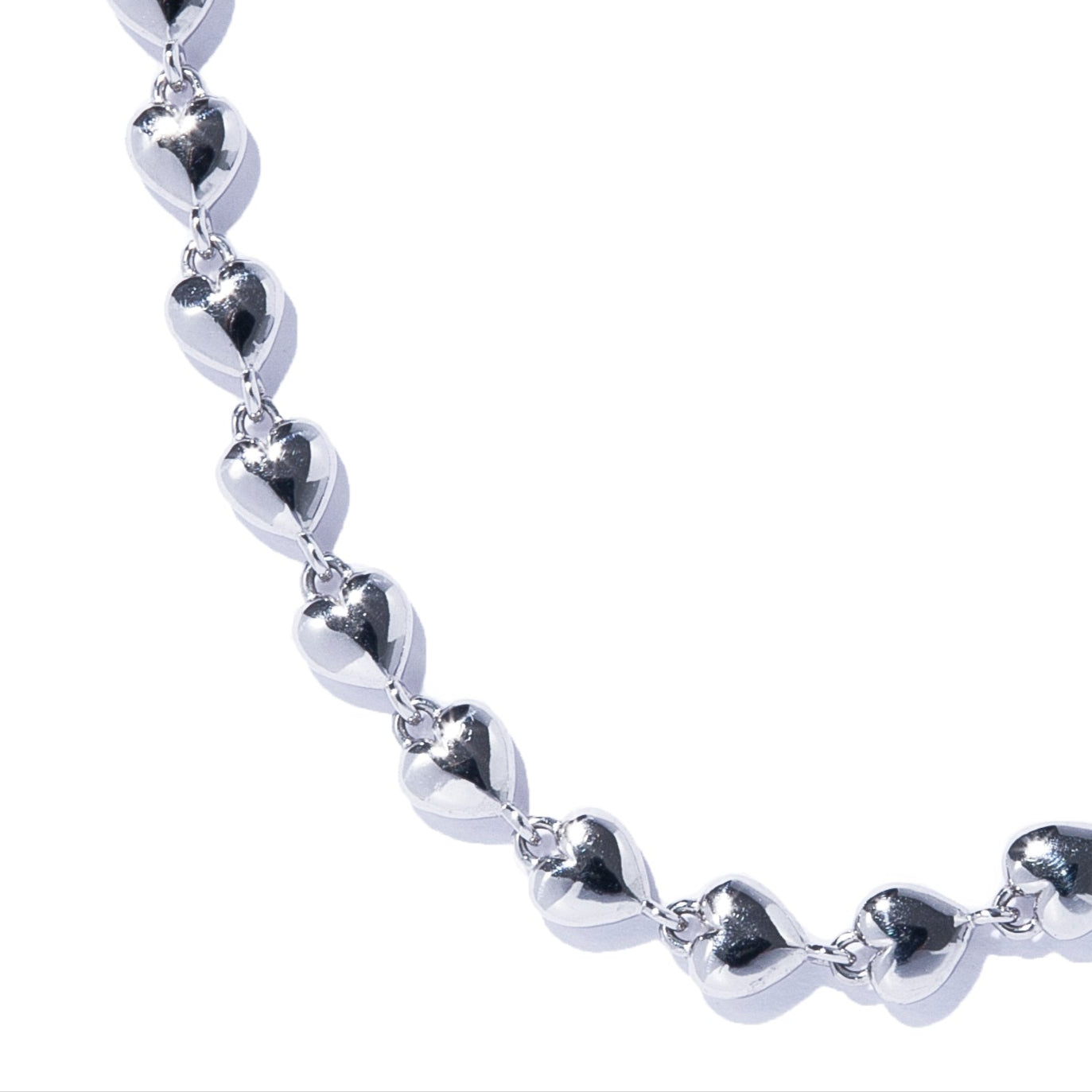 同デザインのブレスレットと合わせて着用するのも。あえてサイズ違いのハートでレイヤードしてみて。