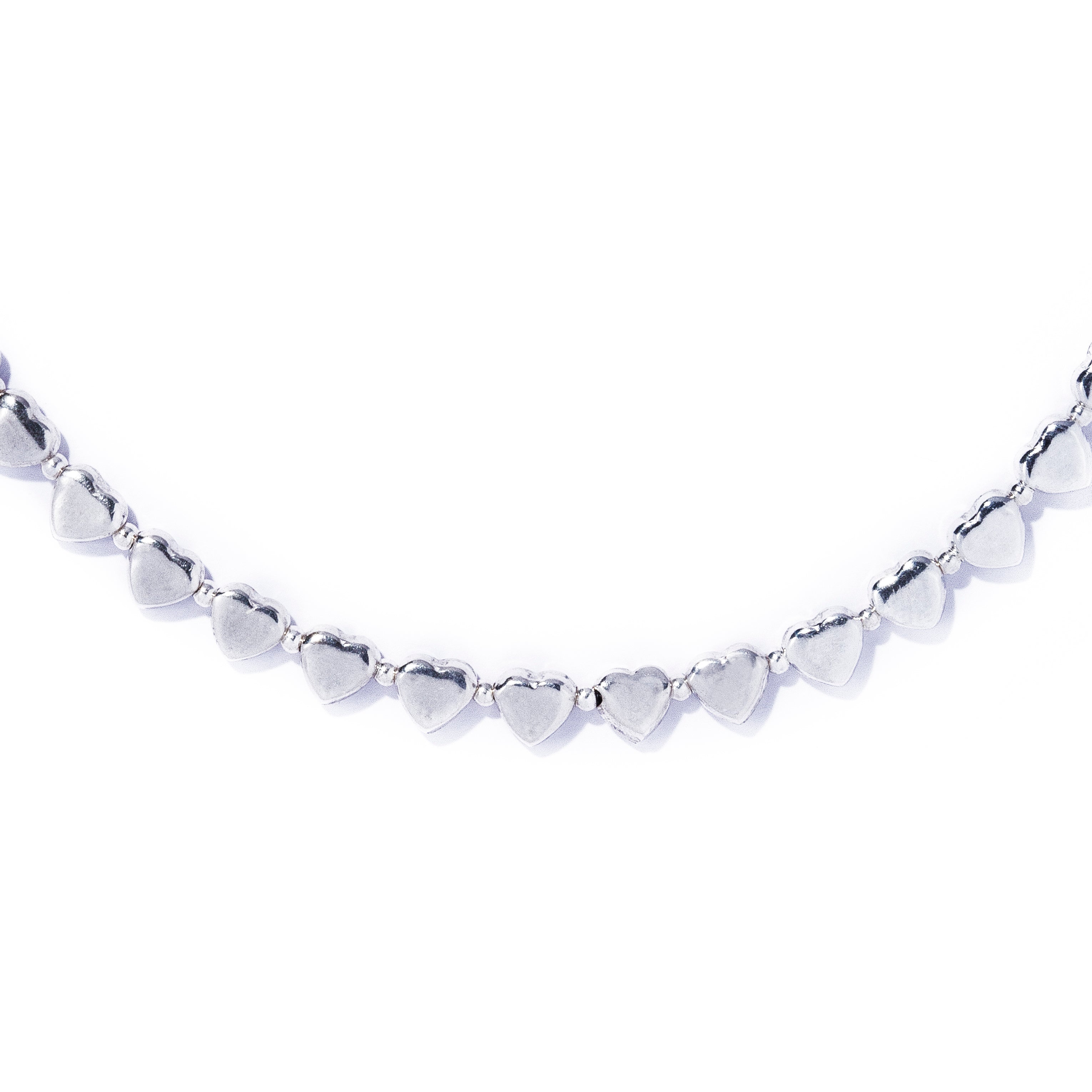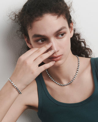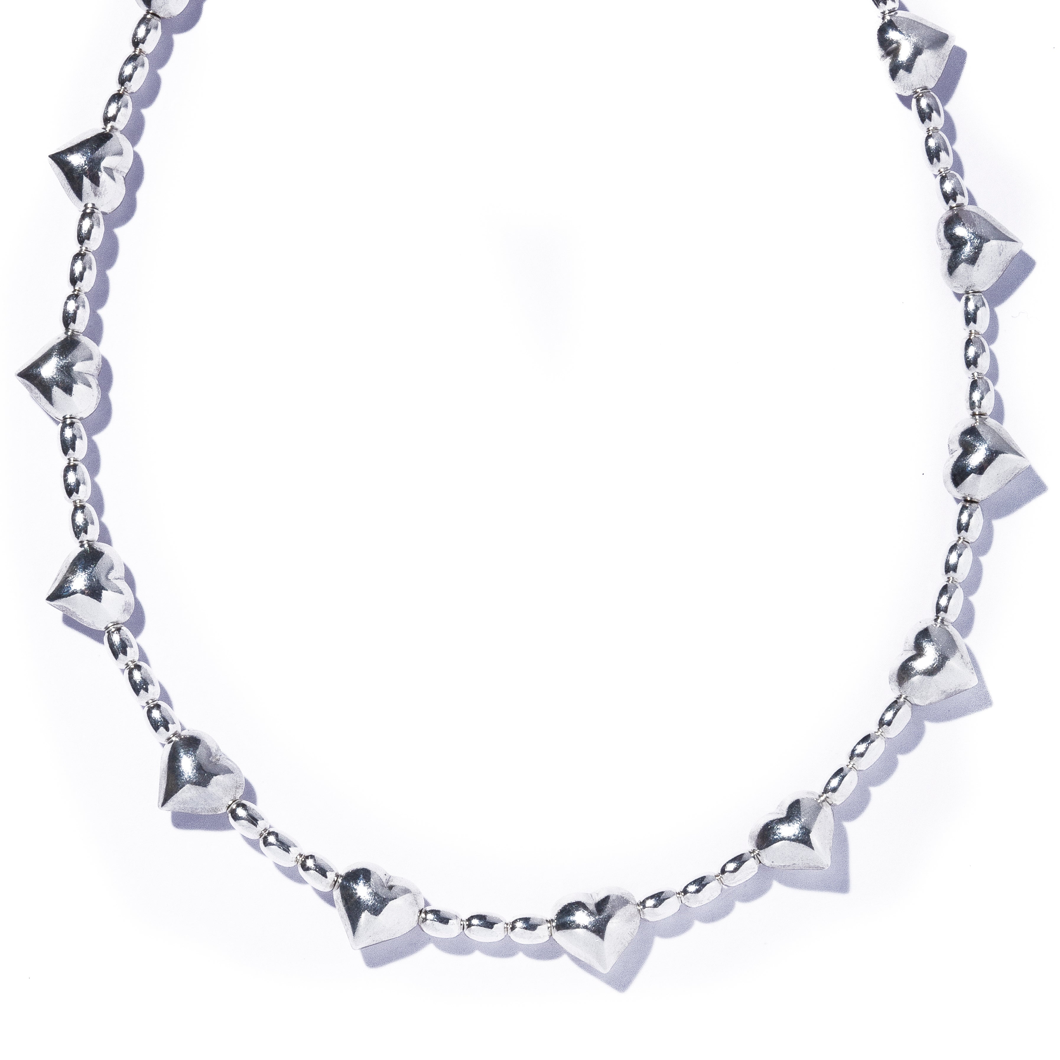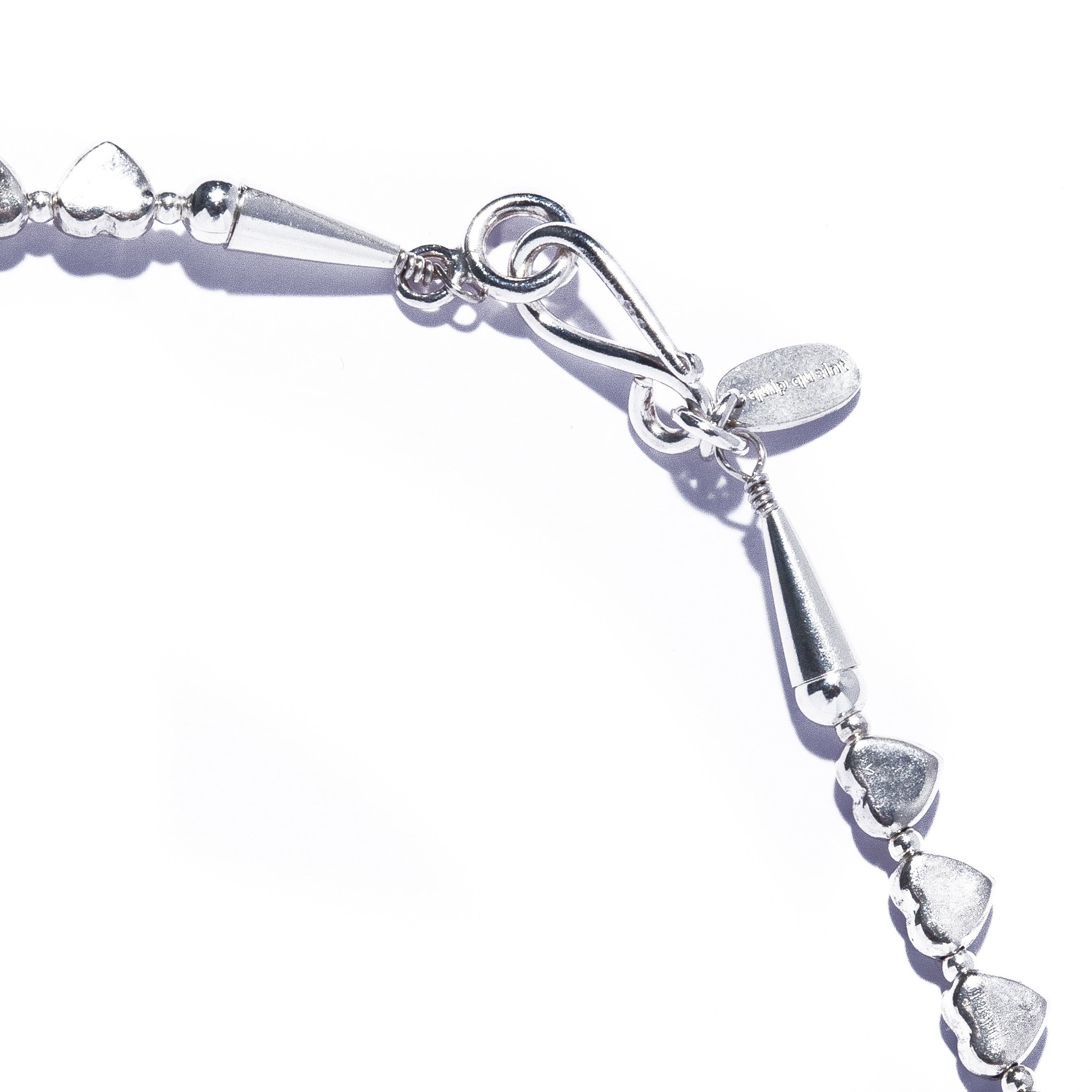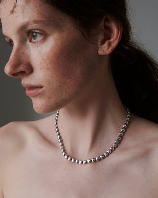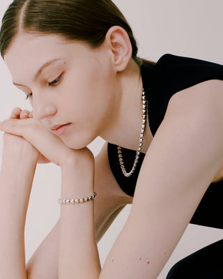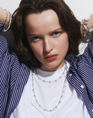 シルバーボールをリズムよく連ねた、視線を奪うチャーミングなネックレス。