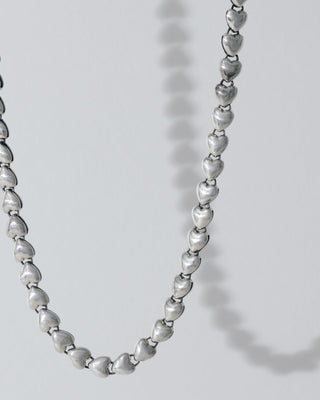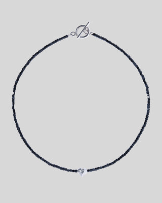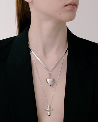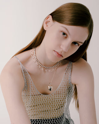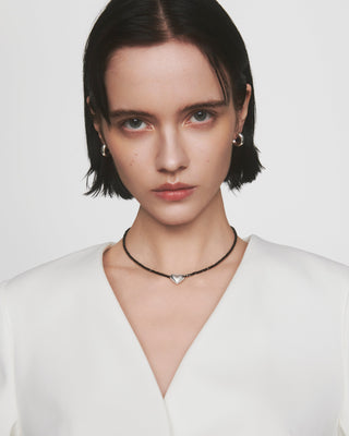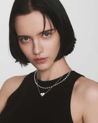 素肌に溶け込む繊細なチェーンにハートモチーフを添えたネックレスをレイヤードしてモードさを足すのも。