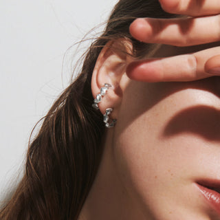 やわらかな光沢を帯びたシルバーに、横長のハートが等間隔に並ぶミニマルなバングル。