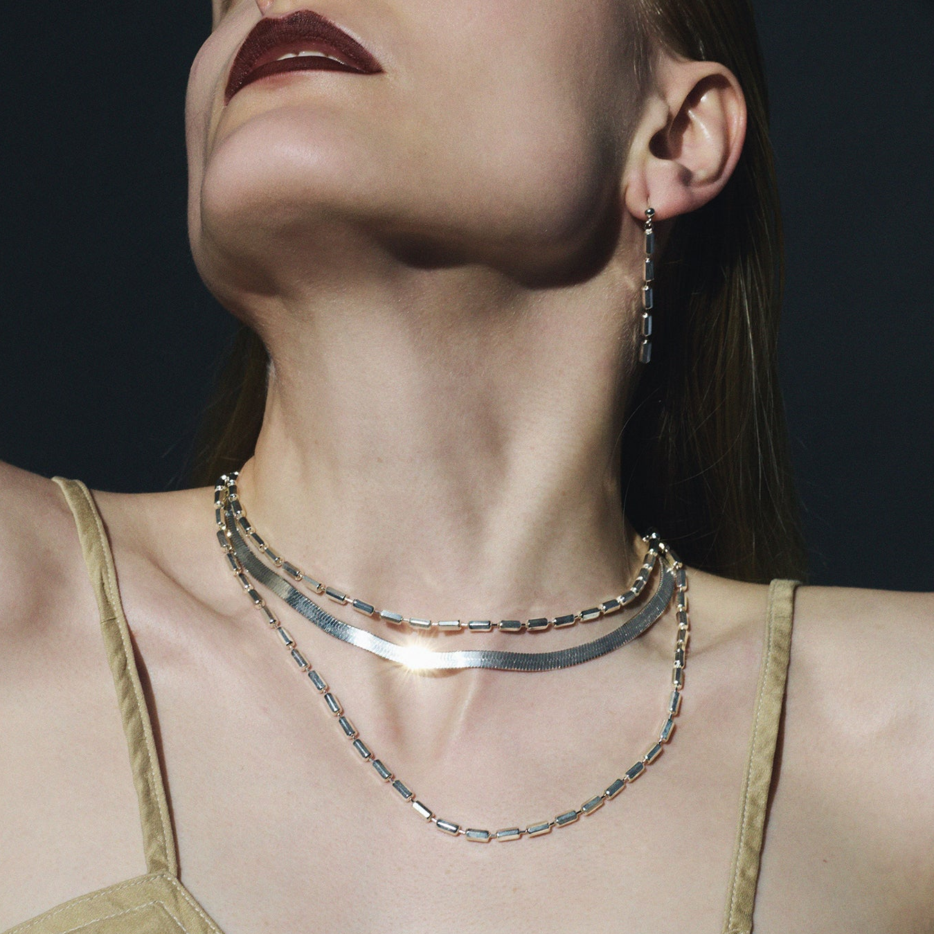 プレーンなチェーンネックレスやミニマルなチョーカーと重ねれば、長さと質感のコントラストが生まれ、立体感のあるバランスに。