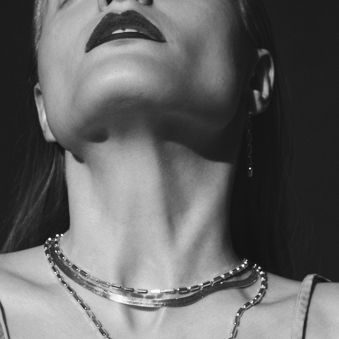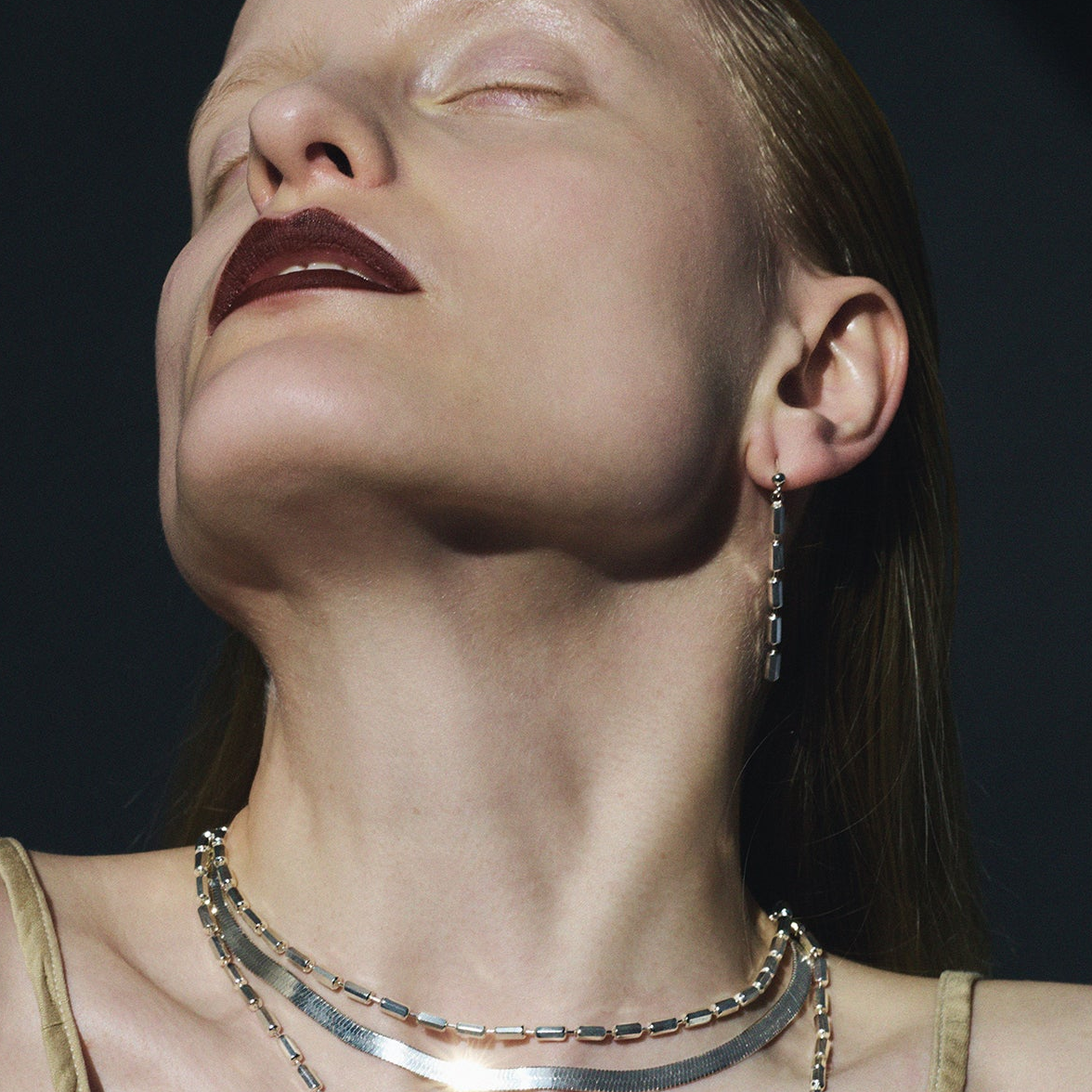 ミニマルなトップスやシャープな襟元には、縦のラインが映えるアクセントとして。