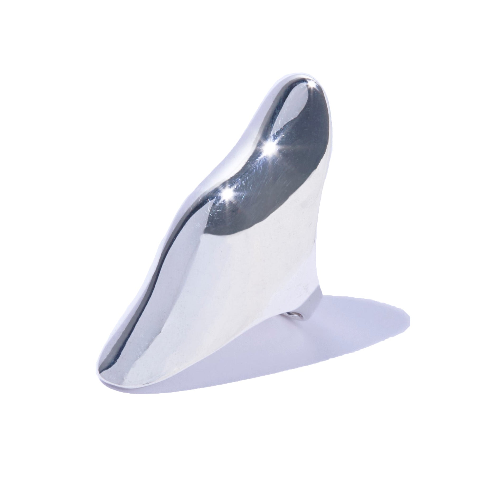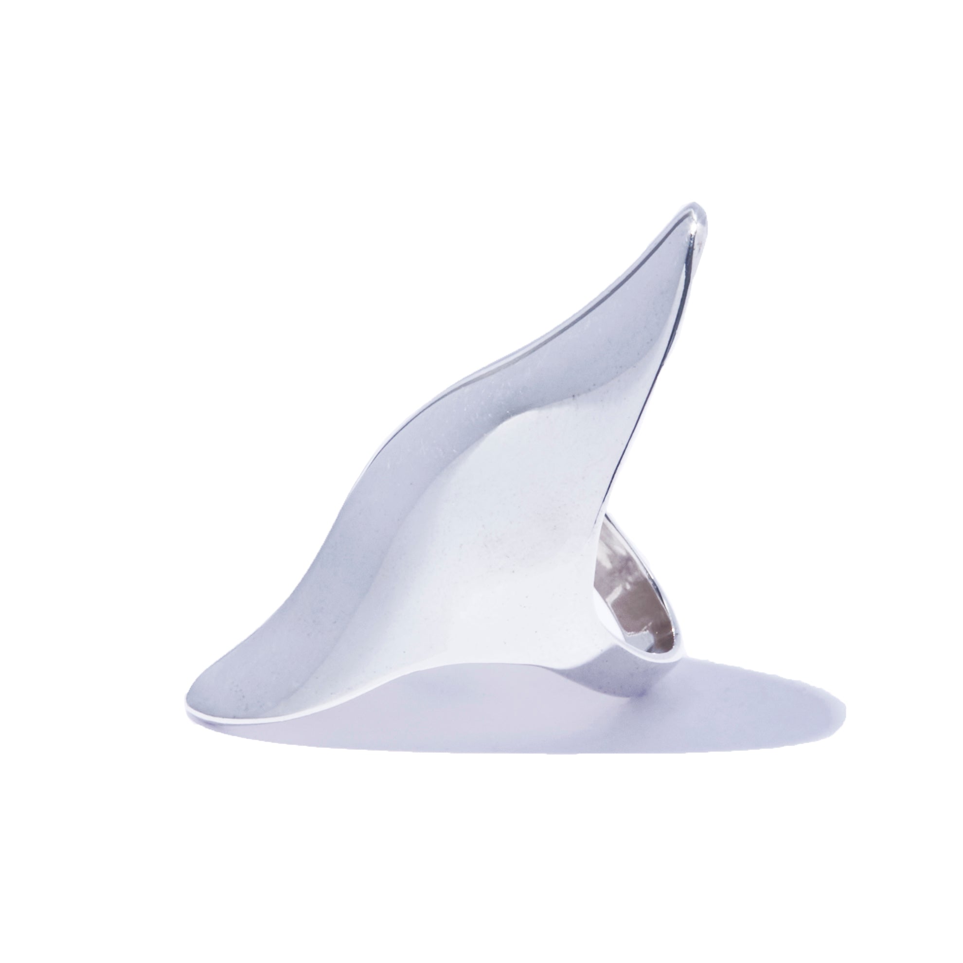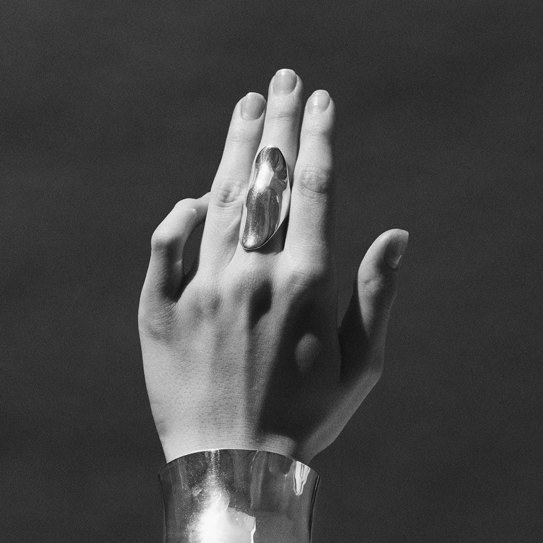 滑らかな曲面が指先を覆うように描かれた、彫刻的な佇まいのリング。
