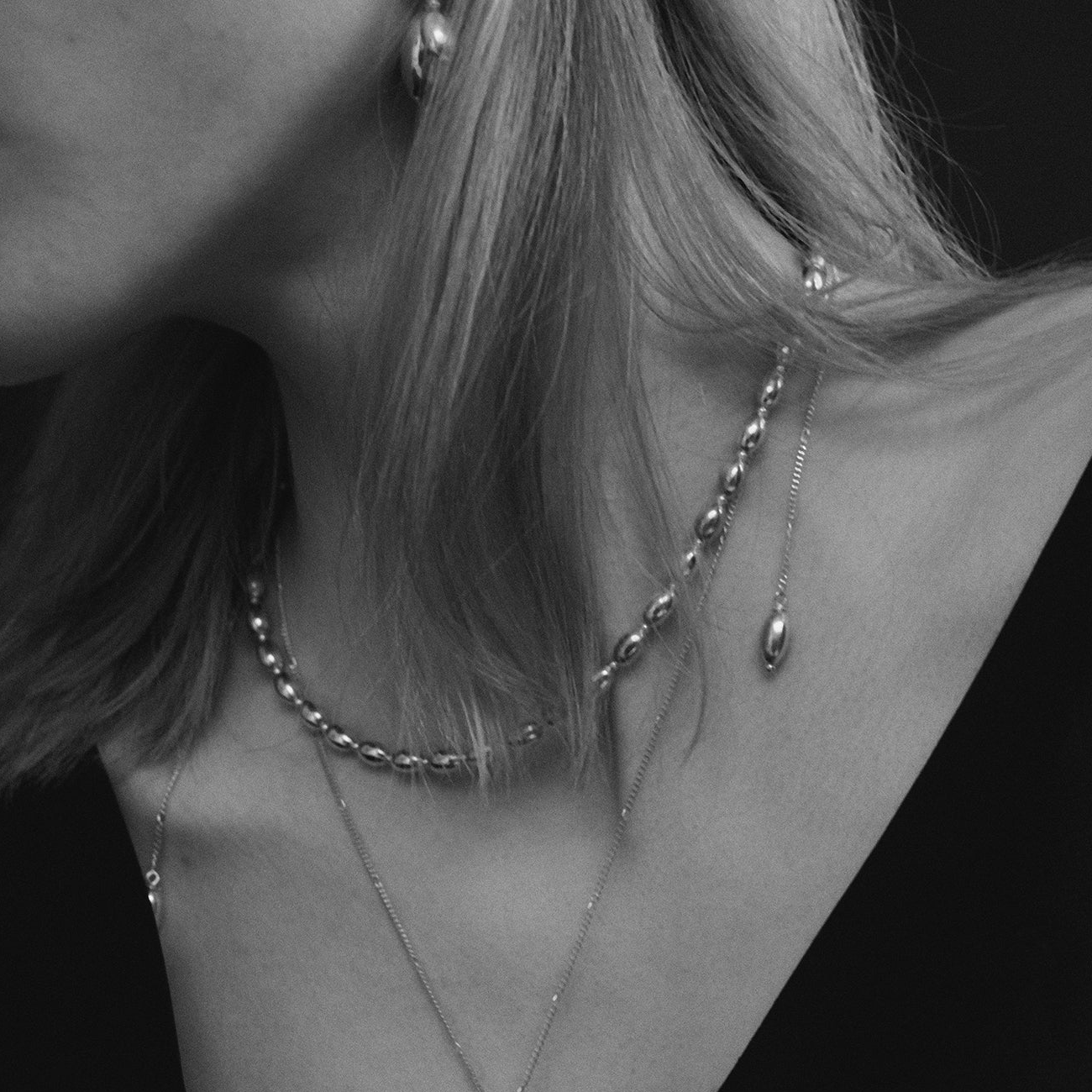 しなやかに続くカーヴィーなシルエットが素肌に沿い、首元にやわらかな陰影を生み出します。