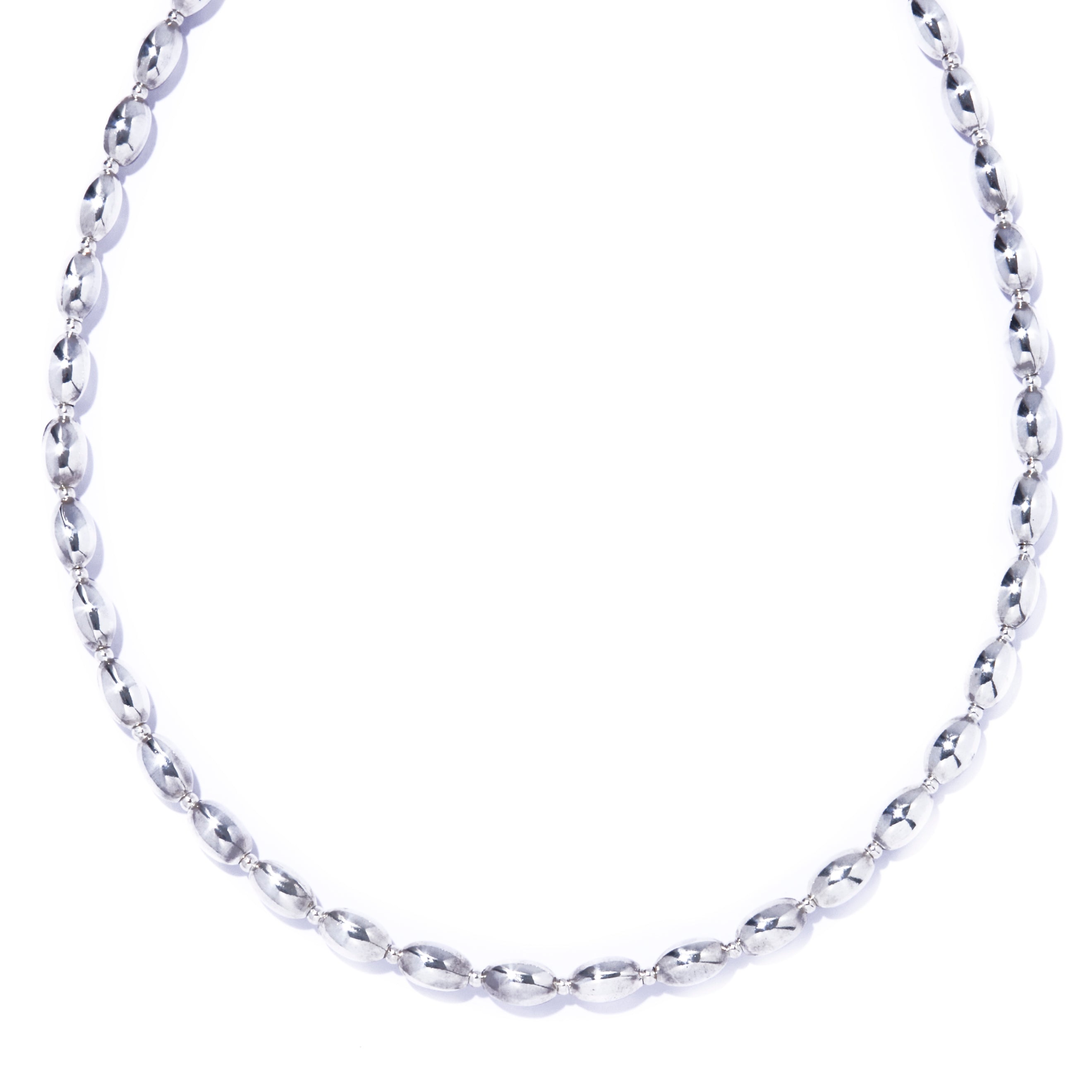 シルバー925の艶が光をやわらかく受け止め、首元にクリーンで洗練された表情をプラス。