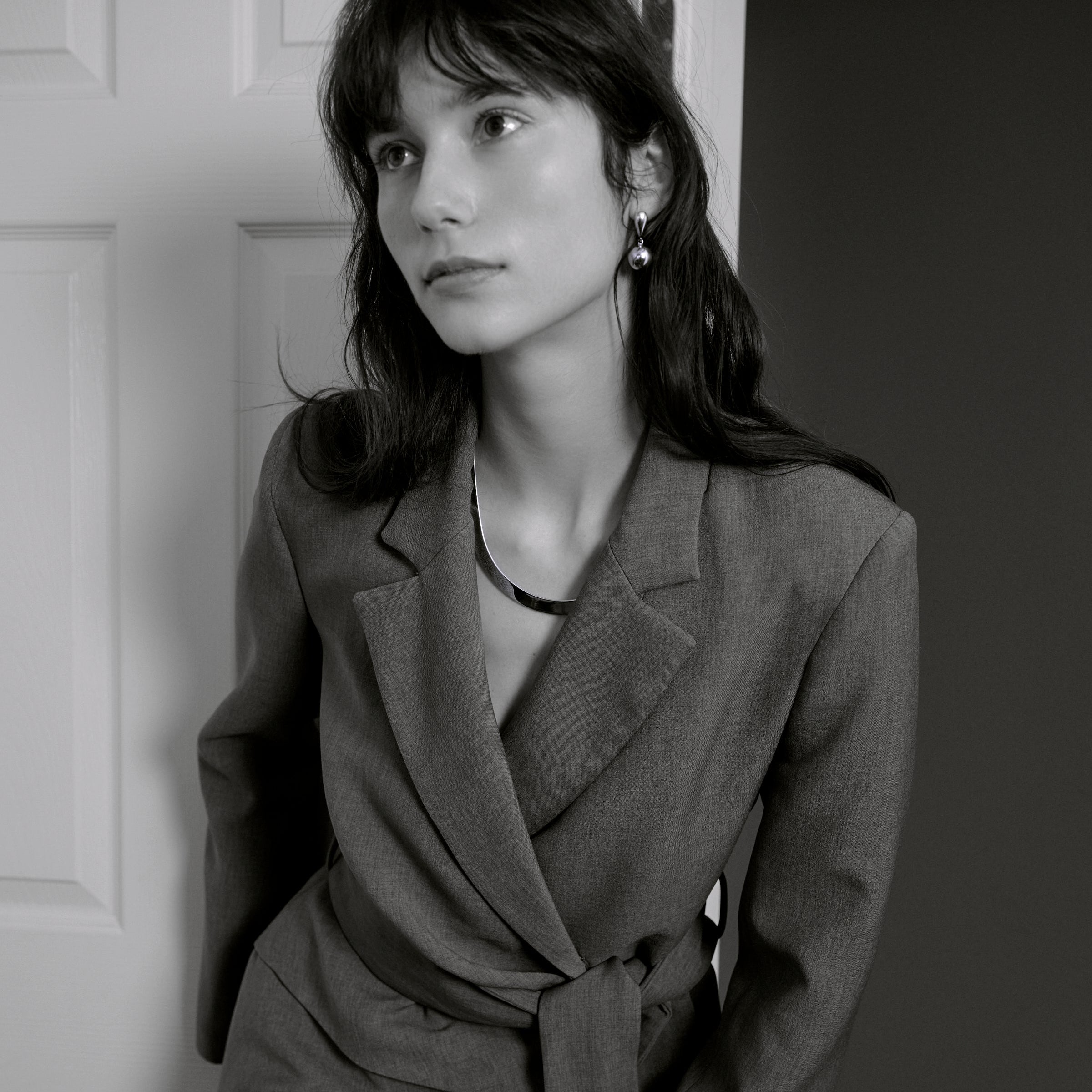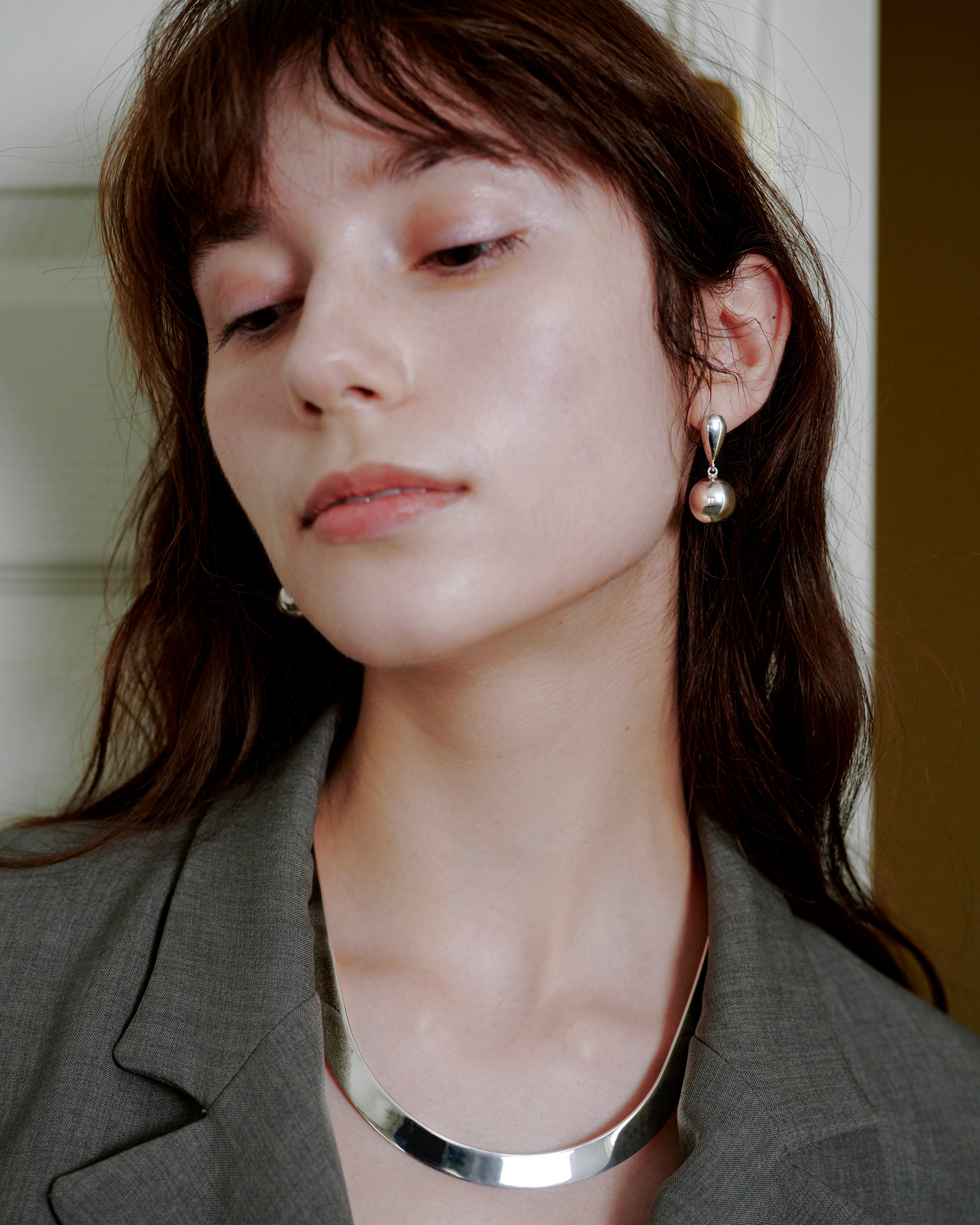 デコルテには同デザインのbowling necklaceを合わせて統一感のあるミニマルなスタイルに仕上げてモードな印象に。
