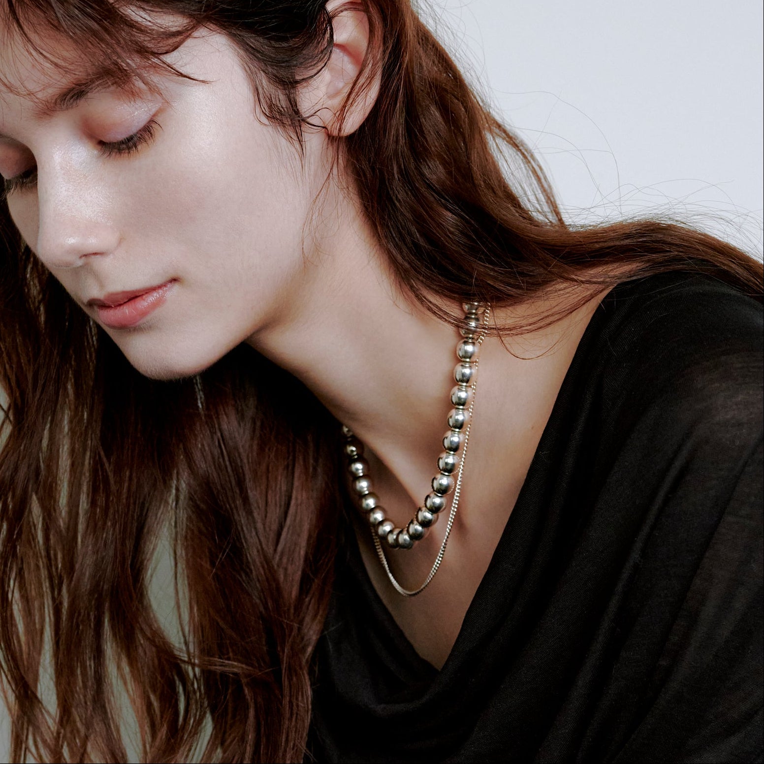 シルバーボールとチェーンを合わせたレイヤードデザインネックレス。